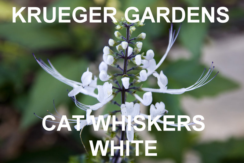 | CAT WHISKERS WHITE (Orthosiphon aristatus) This tender perennial shrub grows 2 to 4' tall and up to 3' in width. The blooms which are usually white, but also bluish-purple, grow on 6" stems with long stamens resembling a cat's whiskers, blooming from summer to early fall. It can survive full sun, but afternoon shade and frequent watering are especially helpful in hot climates. It will quickly wilt when the soil becomes dry. You will have more blooms if you snip off the faded flowers. Attracts bees, butterflies, and hummingbirds. Protect from freezing weather. Zone 9-11. |