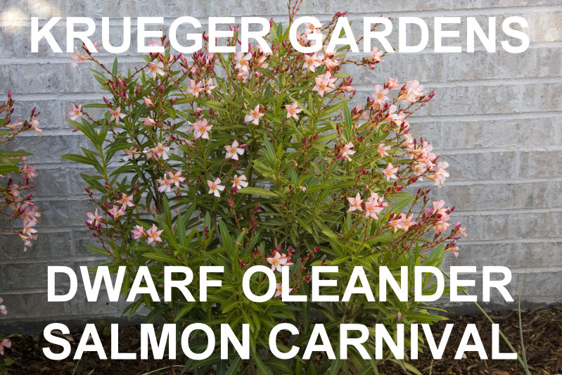 | DWARF OLEANDER (Nerium oleander ‘Turner’s Carnival’) Petite ever blooming salmon pink, single blossom oleander with burgundy margins leading to the edge of each curled petal. The eye is pinkish yellow with burgundy stripes. The Carnival can easily be kept to 3 or 4 feet , but will grow to 5-6 feet unless cut. Blooming time is earlier than other oleanders and lasts until frost. Zones 9-10. Root hardy Zone 8. No special soil or cultivation requirements. |
