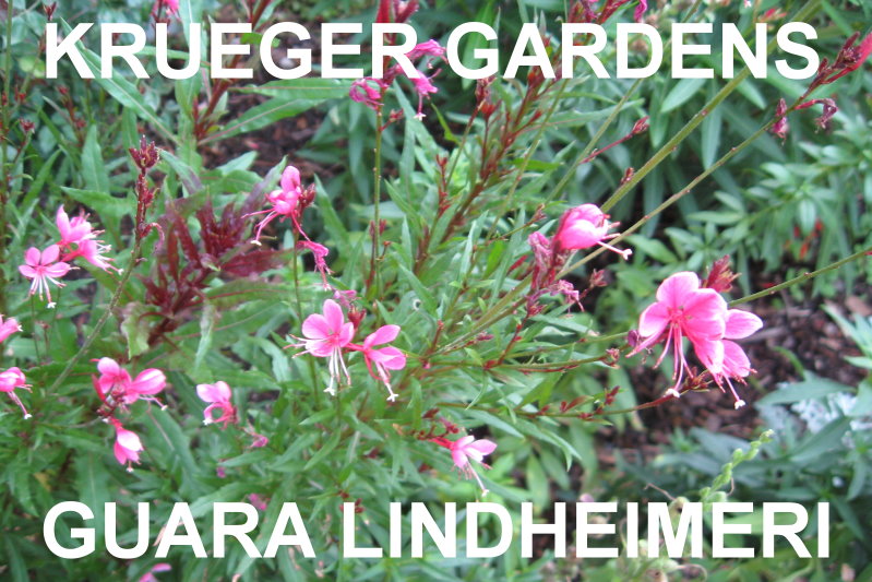 | GUARA LINDHEIMERI (Guara lindheimeri) Upright perennial, clumping, simple lanceolate leaves along stems that end in profusion of pink or white, delicate, butterfly-like flowers from early Spring until frost. ‘Whirling Butterflies’ is a white cultivar. Guara lindheimeri, a Texas Native, does best in rich, alkaline soil and full sun. Since it is tap-rooted, it does not transplant well once established, but is very drought tolerant. The long flower spikes provide a marvelous background for lower-growing flowers. It grows to 2-4’tall x 2-3’ wide. New cultivar "Siskiyou Pink" is very pink and quite attractive. It is more compact and will become scruffy in the middle if not pruned during mid-summer. Plant for Zones 5-10. |