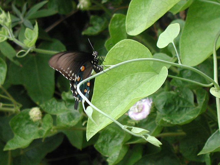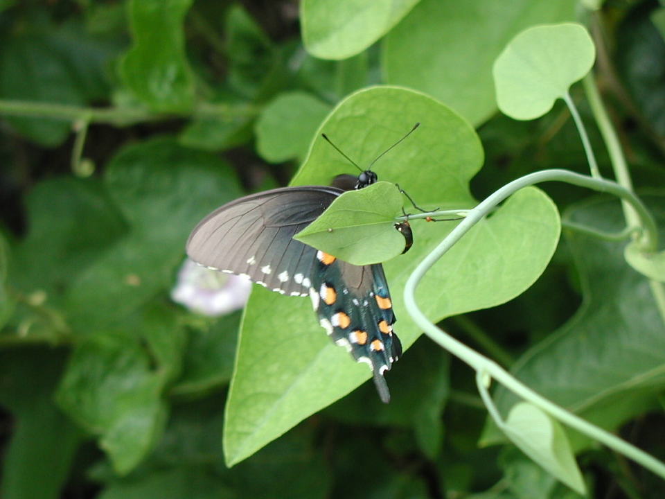 | These older photos taken at VEG a few years ago show a female Pipevine Swallowtail laying an egg on Aristolochia tomentosa. You can see at least one little orange egg on the leaf. | ||||||||||||||||||||||||||||||||