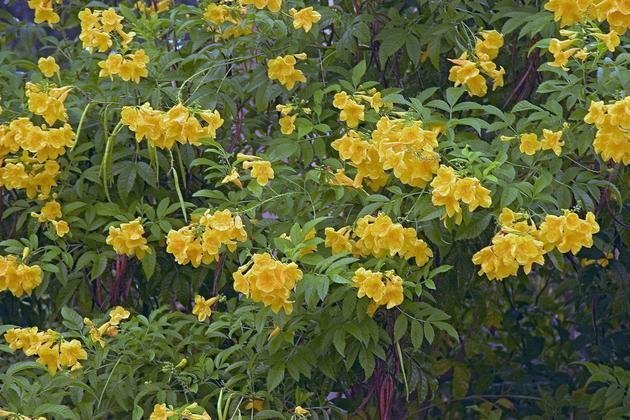 | PHOTOS BY HENRY HARTMAN/CREATIVE IMAGES The tubular flowers of the esperanza resemble "yellow bells" and grow in clusters. The blooms attract butterflies, bees and other pollinators. |